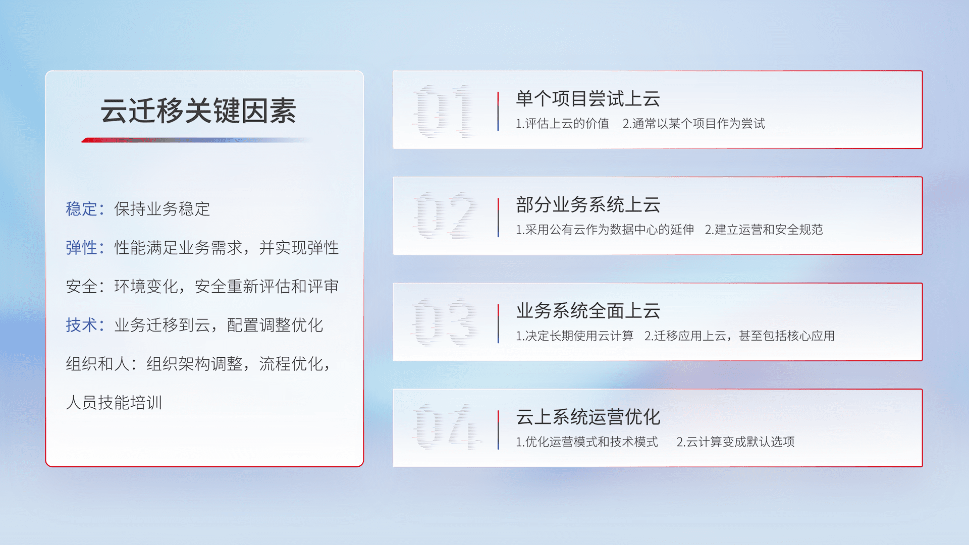 结合实际业务,,,从规划设计、、、、云平台选型、、云原生改造、、、数据迁移、、、集成交付,,,,迁移全过程为客户识别最佳上云路径,,,,做好风险识别管理,,,,设计网络架构、、、、身份权限、、安全审计合规、、操作审计、、日志审计、、、监控告警策略、、、多站点容灾设计等,,,,对云上基础设施进行整体规划,,,,提升IT治理水平,,以满足弹性、、高可用、、高性能的需求。。