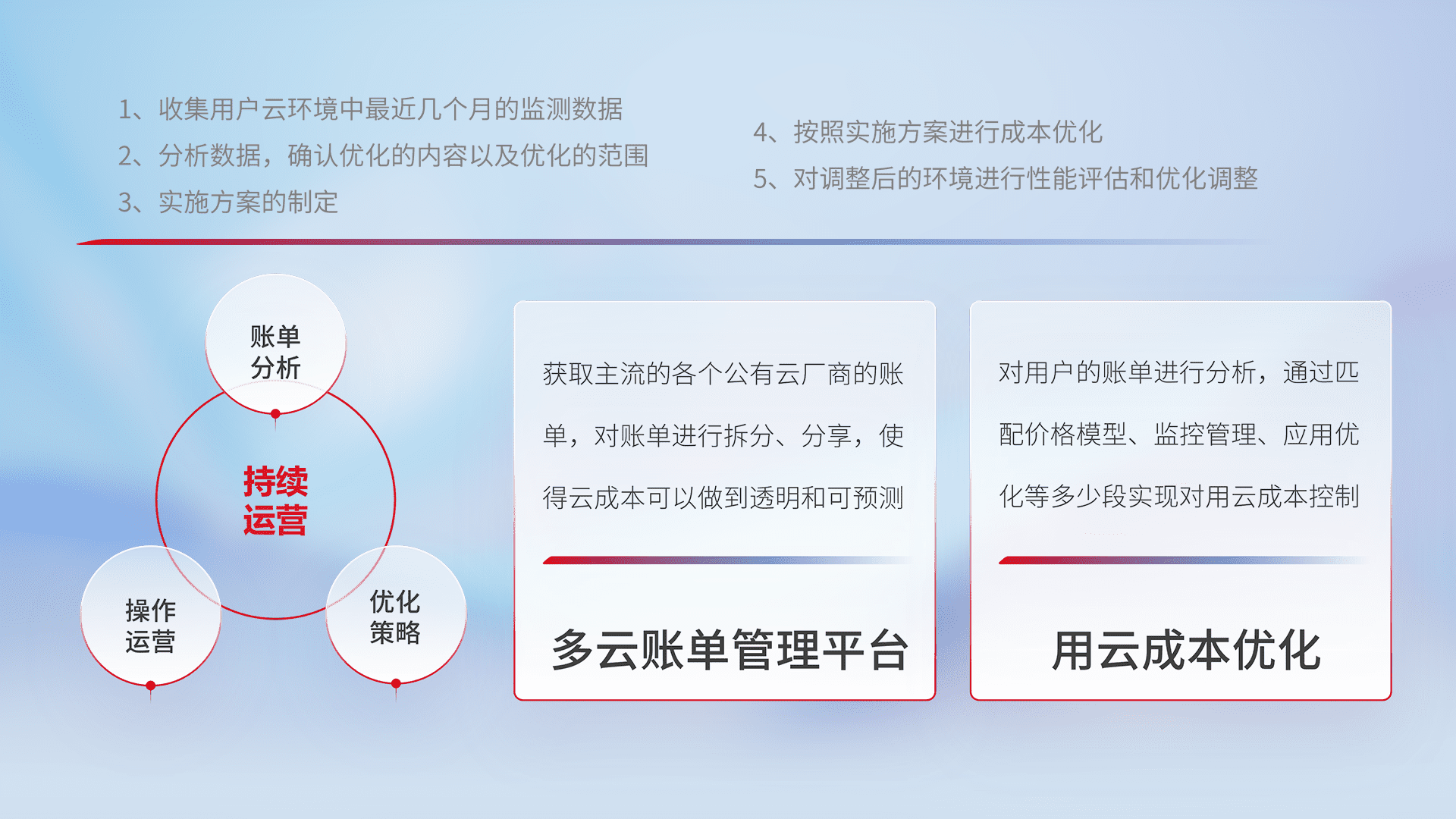 通过多云纳管,,,以统一的资源数据模型把客户的云资源进行抽象和封装,,,进而实现对多云资源的统一操作,,保障云资源管理的可靠性、、、稳定性与可用性。。。。量身定制化运维内容,,,,配置、、、开发运维、、、、补丁管理、、、备份、、监控、、、认证和访问管理、、、、审计和日常巡检等,,保障在用云过程中的可靠度,,稳定度以及高可用率。。